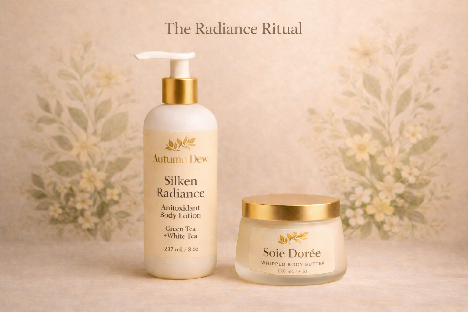 The Radiance Ritual combines antioxidant protection with velvety nourishment. Silken Radiance infuses the skin with green tea and white tea antioxidants, while Soie Dorée envelops the body in a rich whipped butter infused with rosehip oil and prickly pear seed oil.