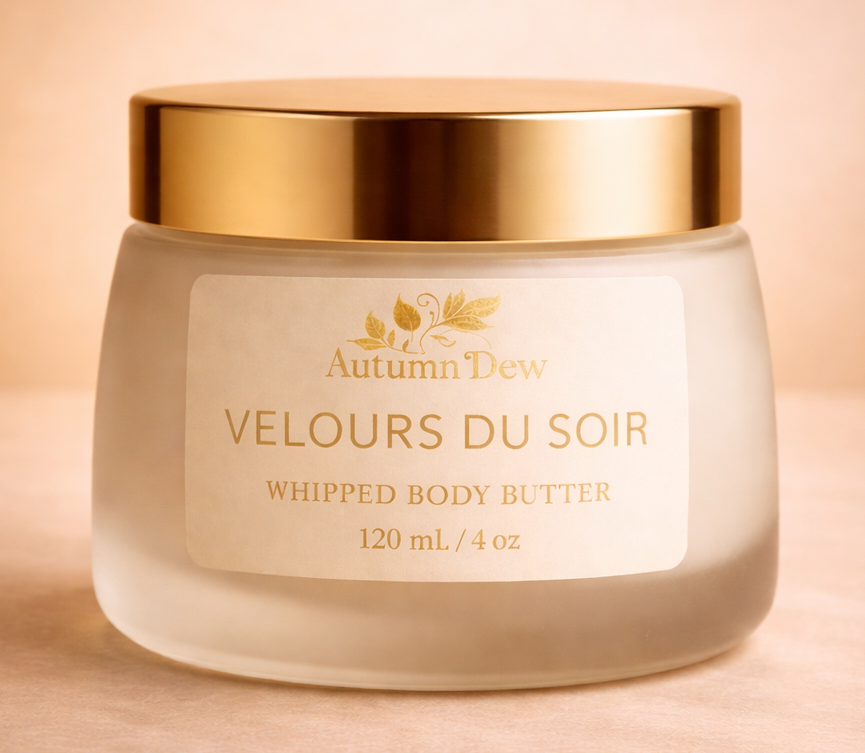 Velours du Soir is a rich whipped body butter created for moments when the skin needs deeper restoration. Its plush, velvety texture melts slowly into the body, delivering lasting nourishment while leaving the skin beautifully soft and comforted.